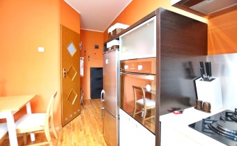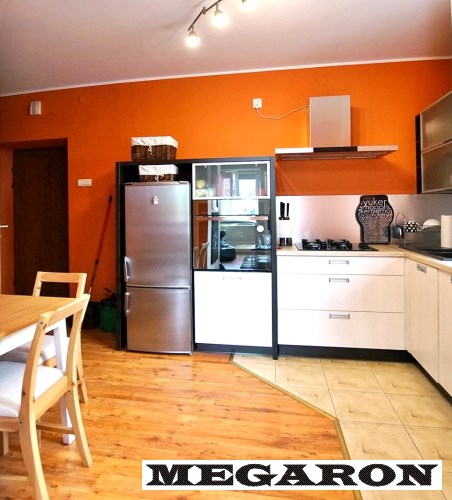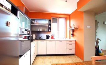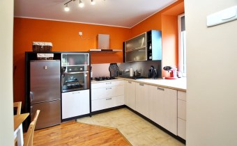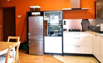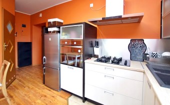 Appliances, chairs, dishes, gas stove, kitchen furniture to size, pots, refrigerator, silverware, sink with battery, table