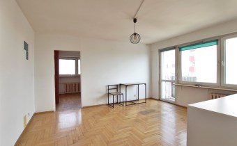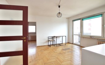 Salon z wyjściem na balkon i wydzieloną dodatkową pokojem/wnęką.