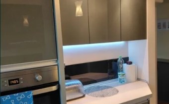 Wnętrze zostało zaprojektowane z myślą o funkcjonalności – zabudowy meblowe wykonane na wymiar przez stolarza maksymalnie wykorzystują dostępną przestrzeń. Całość wyposażenia pozostaje w mieszkaniu.