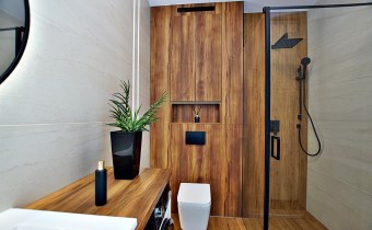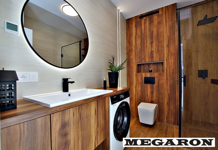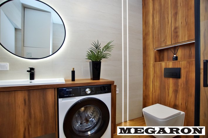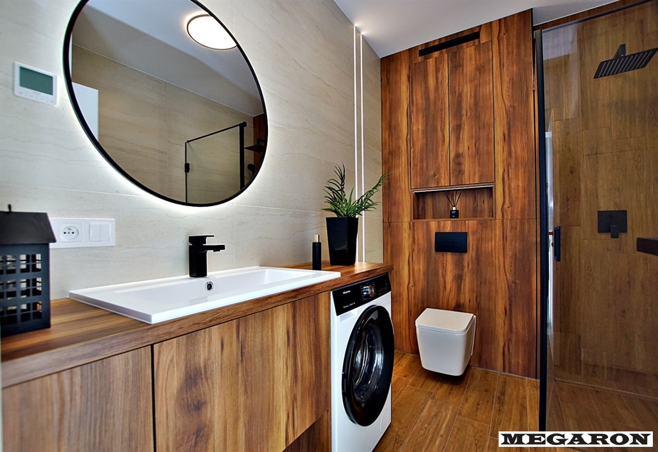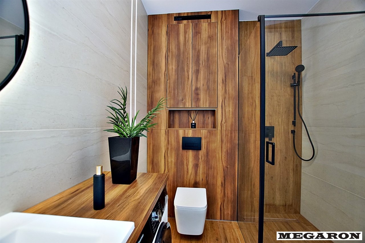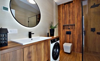 elegancką łazienkę z nowoczesną armaturą, przestronną kabiną prysznicową i meblami na wymiar, w które sprytnie wkomponowano nową pralkę. Dodatkowo, czeka na Ciebie