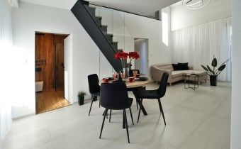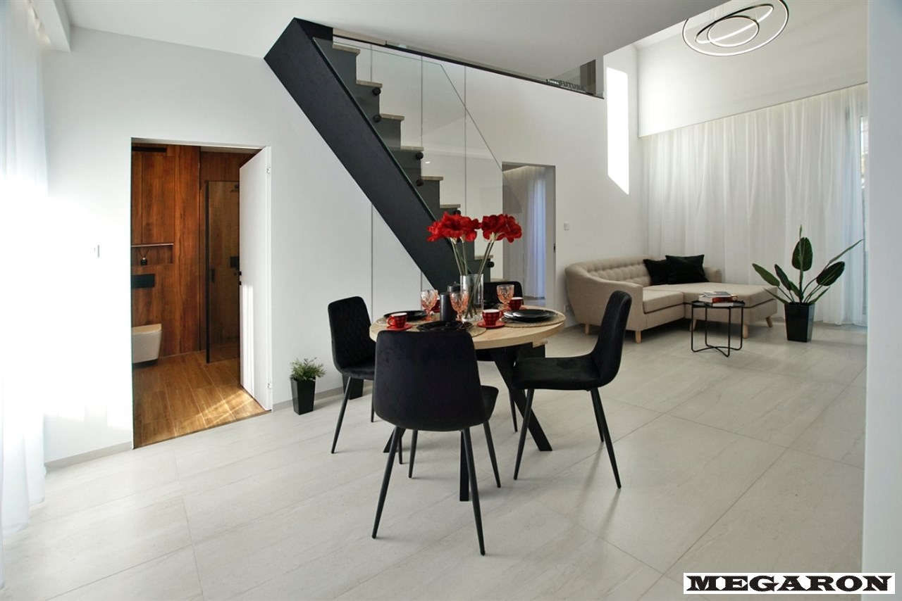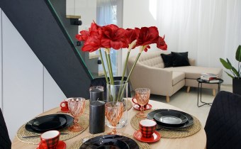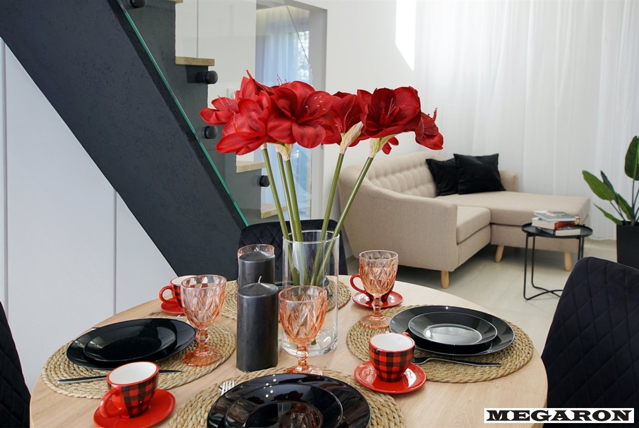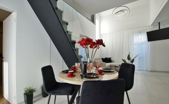 Niestandardowy design: Wyjątkowy układ dwupoziomowy, imponujące czarne schody o odważnej, nowoczesnej linii, przesuwne okna trzyszybowe oraz antywłamaniowe ponadwymiarowe drzwi wejściowe.