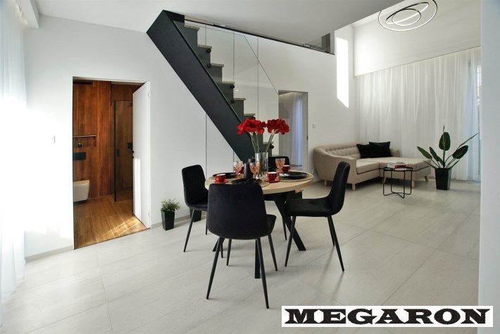 Drzwi wewnętrzne ekskluzywne: Designerskie drzwi wewnętrzne z ukrytymi ościeżnicami podkreślają minimalistyczny i nowoczesny charakter wnętrza.