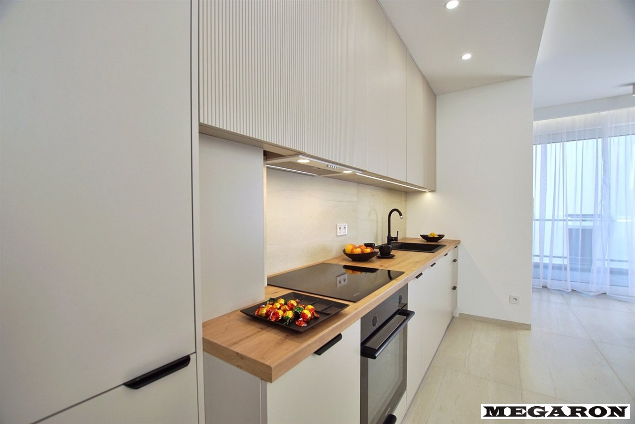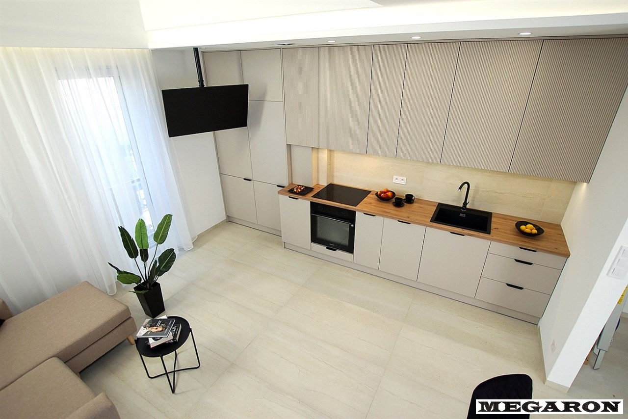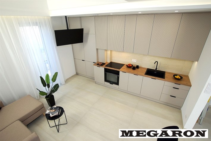 Designerska kuchnia na wymiar: Zabudowa kuchenna w eleganckim kolorze kaszmirowym z modnymi ryflowanymi frontami. W pełni wyposażona w nowoczesny sprzęt AGD najnowszej klasy (piekarnik, płyta indukcyjna, zmywarka, okap) oraz armaturę Franke.