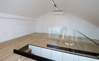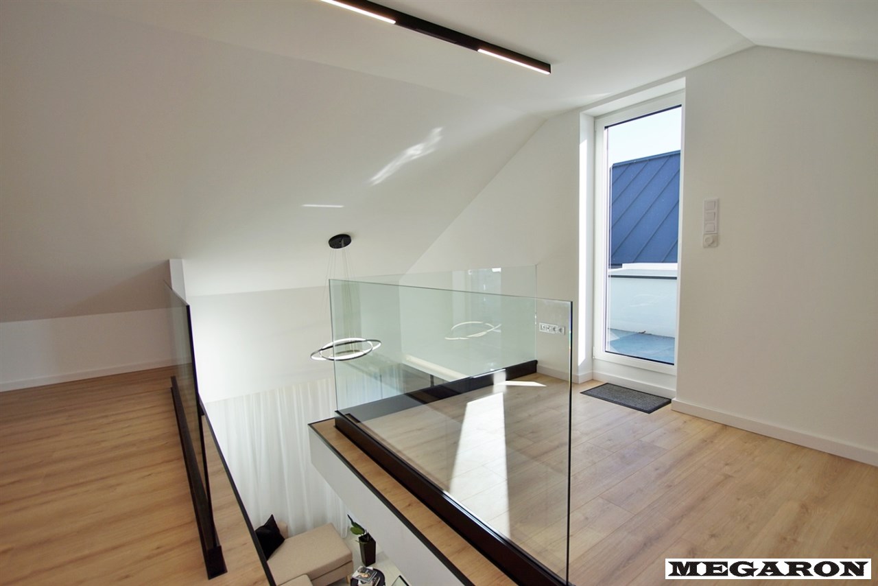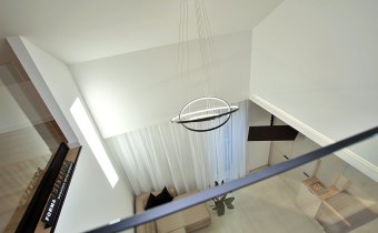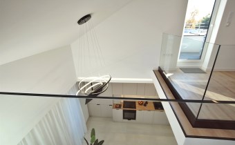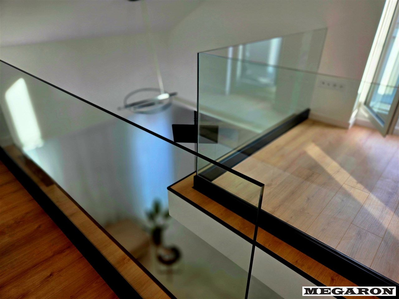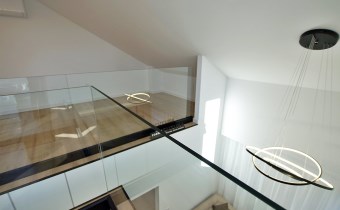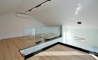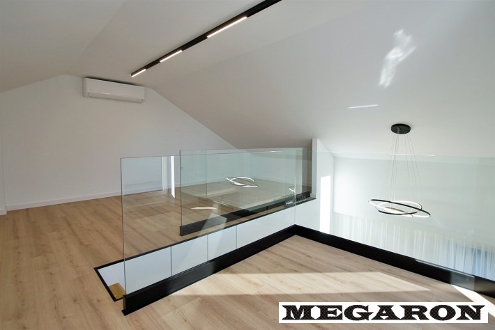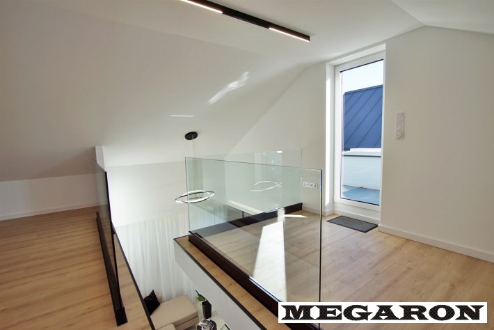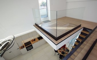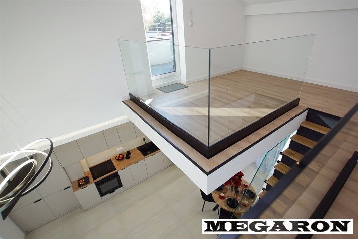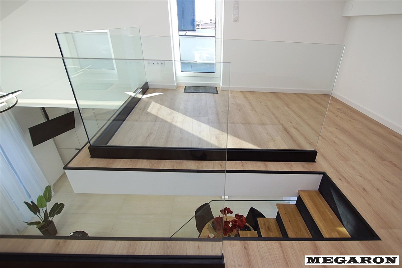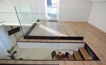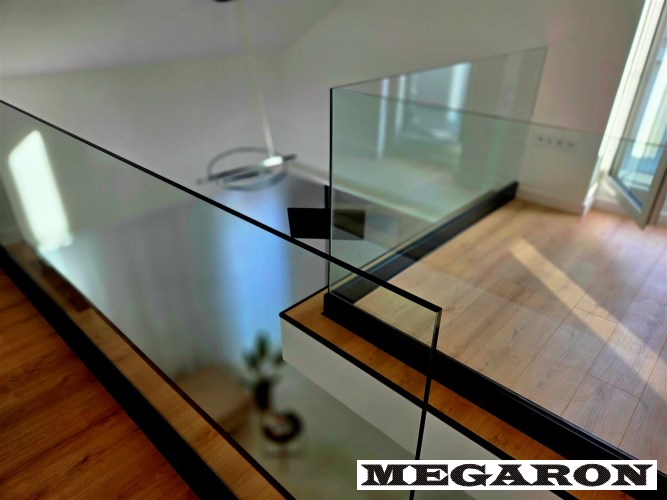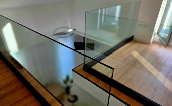 Ekskluzywna balustrada: Bardzo ekskluzywna balustrada ze szkła hartowanego osadzona na eleganckich czarnych dystansach, która jest ozdobą wnętrza i dodaje mu lekkości oraz spektakularnego designu.