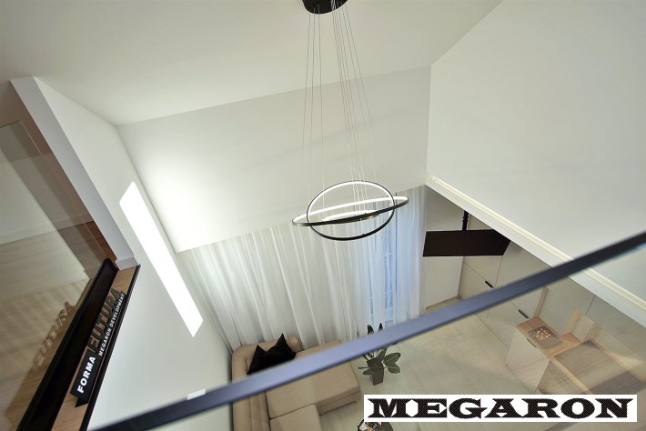Ekskluzywne oświetlenie: Zjawiskowy żyrandol w salonie o ponadstandardowej wysokości (dedykowany dla wysokiego sufitu) oraz nastrojowe oświetlenie LED na antresoli tworzą niepowtarzalny klimat i design.