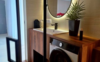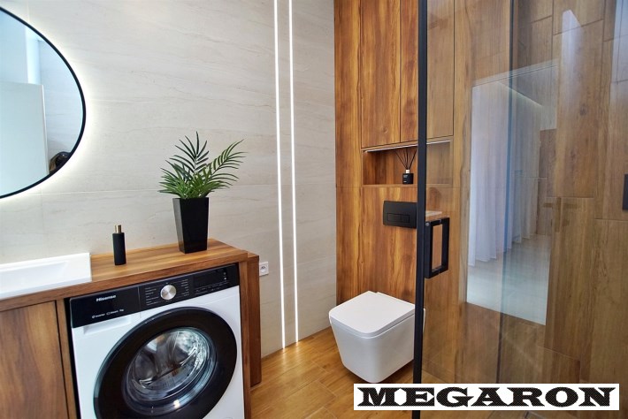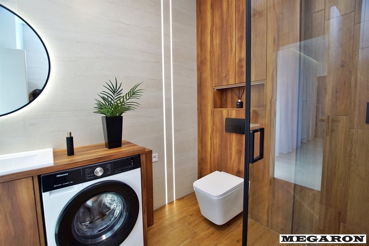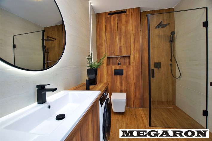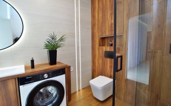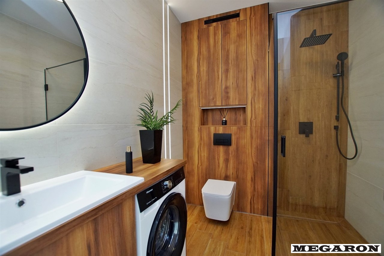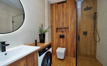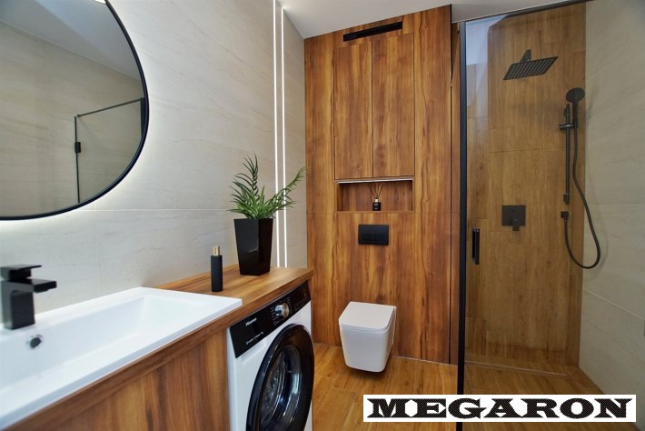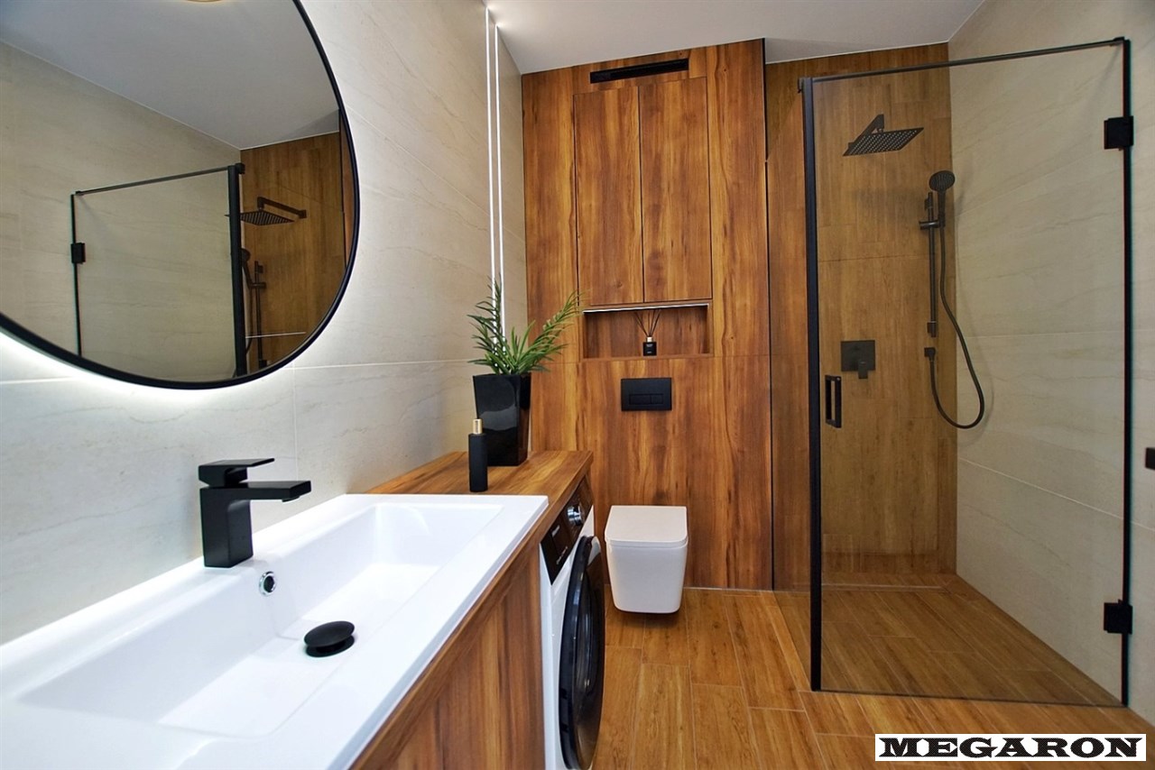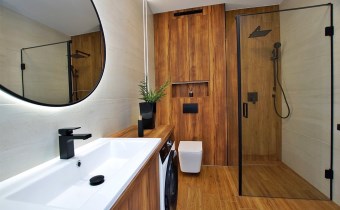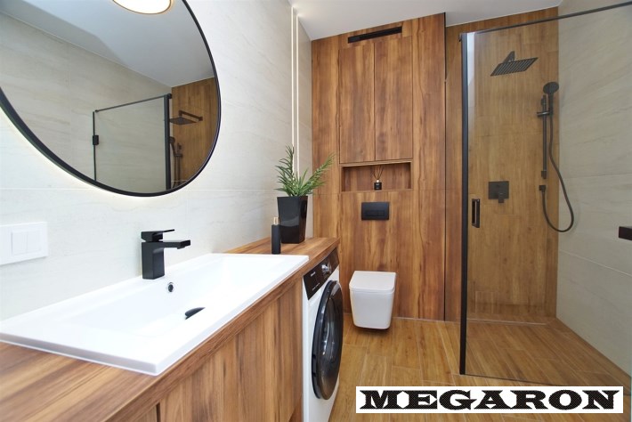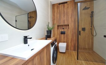Luksusowa łazienka: Wykończona ekskluzywnym gresem, płytkami drewnopodobnymi i drewnianą zabudową. Wyposażona w armaturę Hans Grohe w kolorze czarnym, pralkę oraz przestronną kabinę prysznicową z deszczownicą.