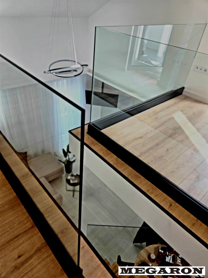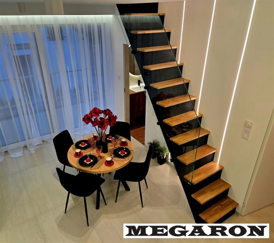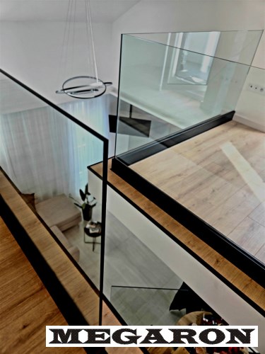 Nowoczesne, czarne schody z drewnianymi stopniami prowadzą na przestronną antresolę (ponad 17 m²) z: