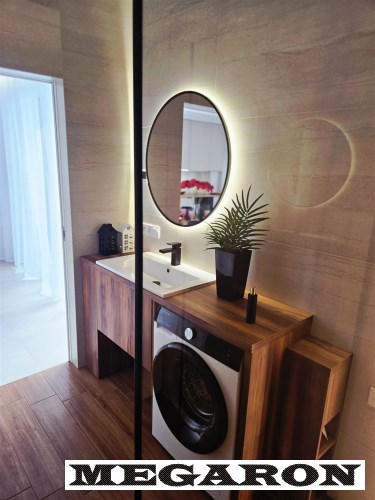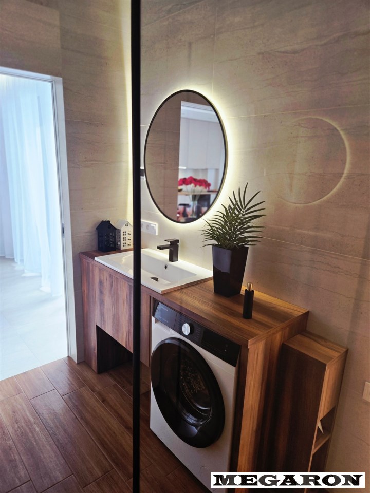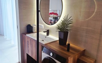 elegancka łazienka z armaturą Hansgrohe, zabudową meblową, pralką i kabiną z deszczownicą.