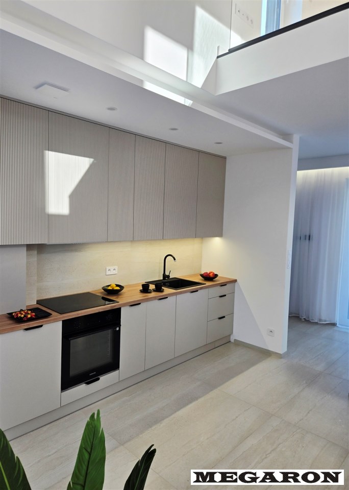 designerska kuchnia w odcieniu kaszmiru z blatem dębowym i kompletnym zestawem nowoczesnego AGD,