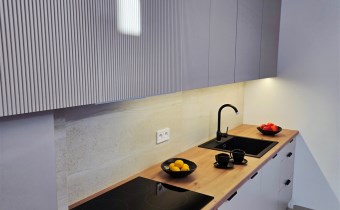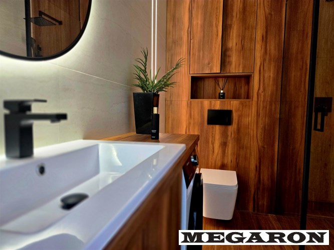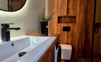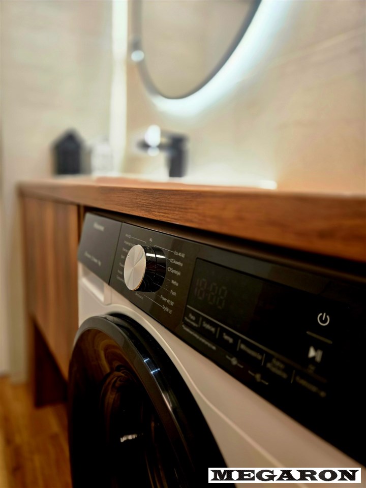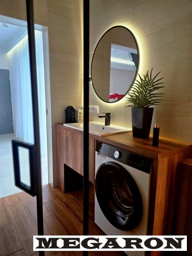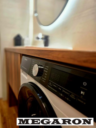 elegancką łazienkę z nowoczesną armaturą, przestronną kabiną prysznicową i meblami na wymiar, w które sprytnie wkomponowano nową pralkę. Dodatkowo, czeka na Ciebie
