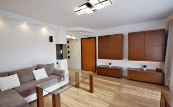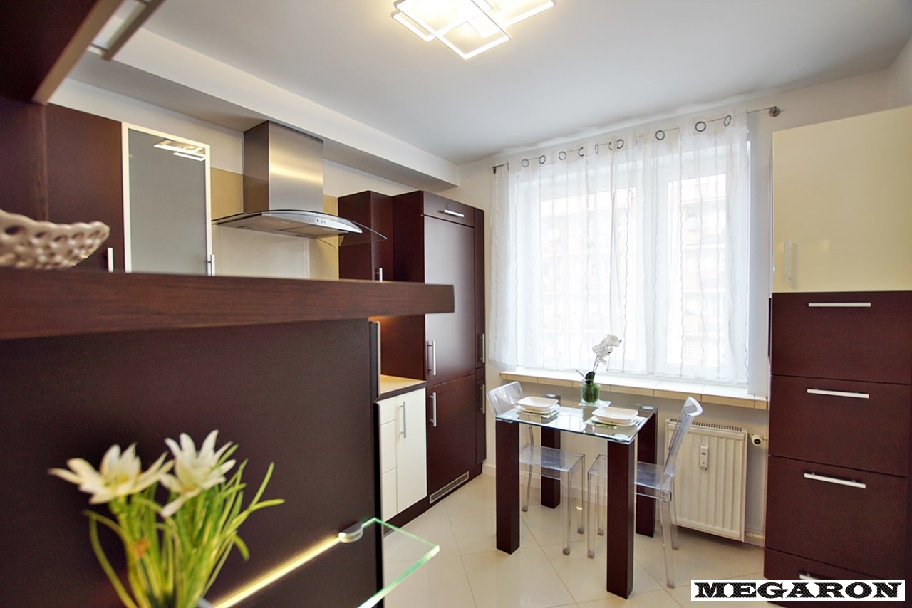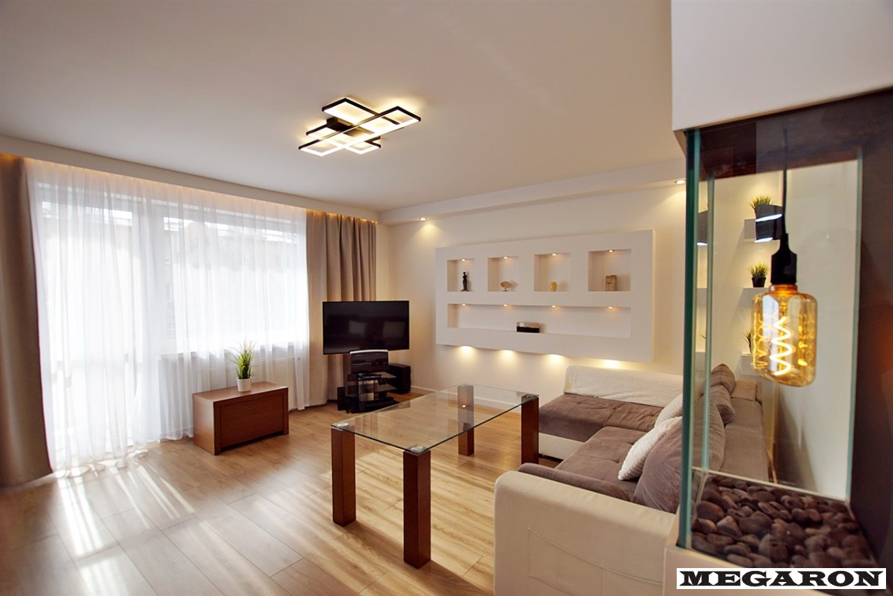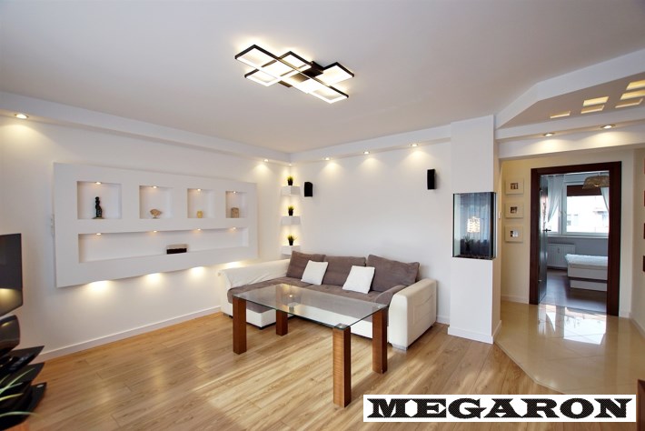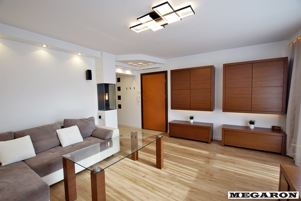 - telewizor, - szklany stół, - kanapa, - nowe zasłony i firany, - rozbudowane dekoracyjne oświetlenie LED (pod meblami, w karniszu, za telewizorem).Całość tworzy spójną, dopracowaną estetykę - mieszkanie jest świeżo odmalowane, dokładnie posprzątane i przygotowane do wprowadzenia się bez jakichkolwiek nakładów finansowych.