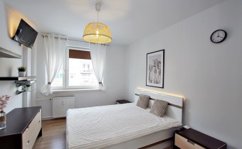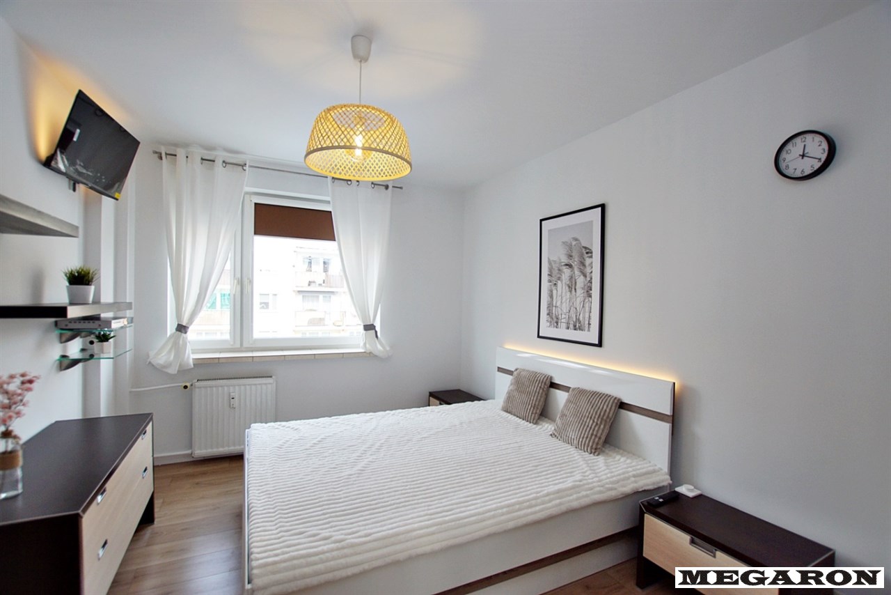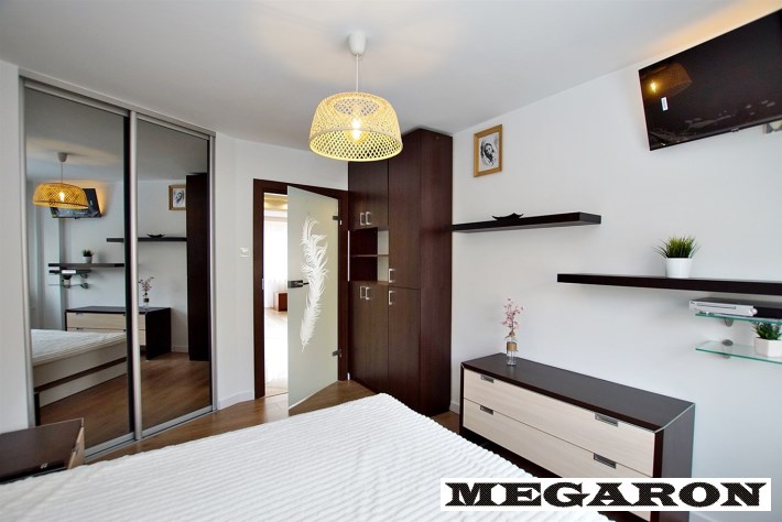 - nowe panele i listwy przypodłogowe, - nowa lampa sufitowa, - nowy telewizor 32” Xiaomi, - dekoracyjne oświetlenie LED (za łóżkiem i telewizorem), - garderoba zapewniająca wygodną organizację przestrzeni (wyposażona w żelazko i odkurzacz) - szklane drzwi