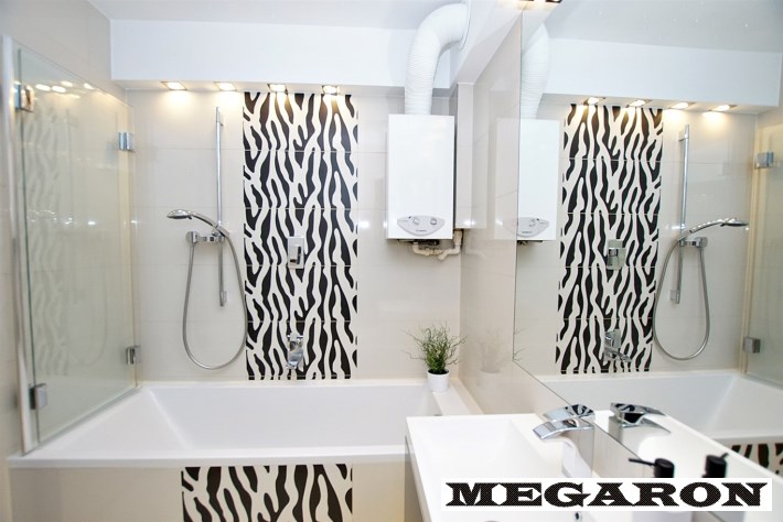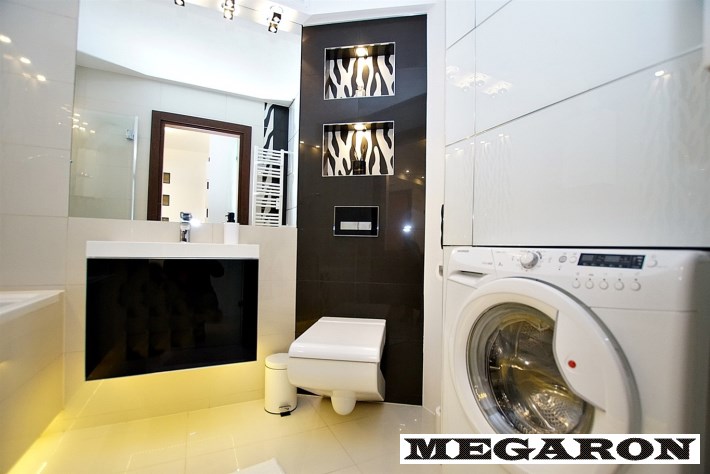 - baterie podtynkowe i umywalkowe firmy Roca, - stelaż podtynkowy i przycisk WC Geberit, - pralka Hoover (wersja slim), - umywalka ze szklaną szafką na wymiar, - szklane drzwi, - sufit z efektownym oświetleniem światłowodowym („gwiezdne niebo”).Ciepła woda z piecyka gazowego Bosch - Junkers.