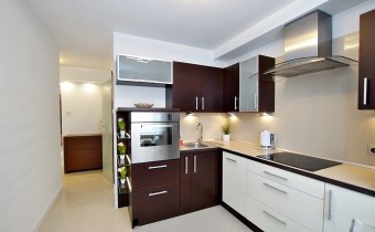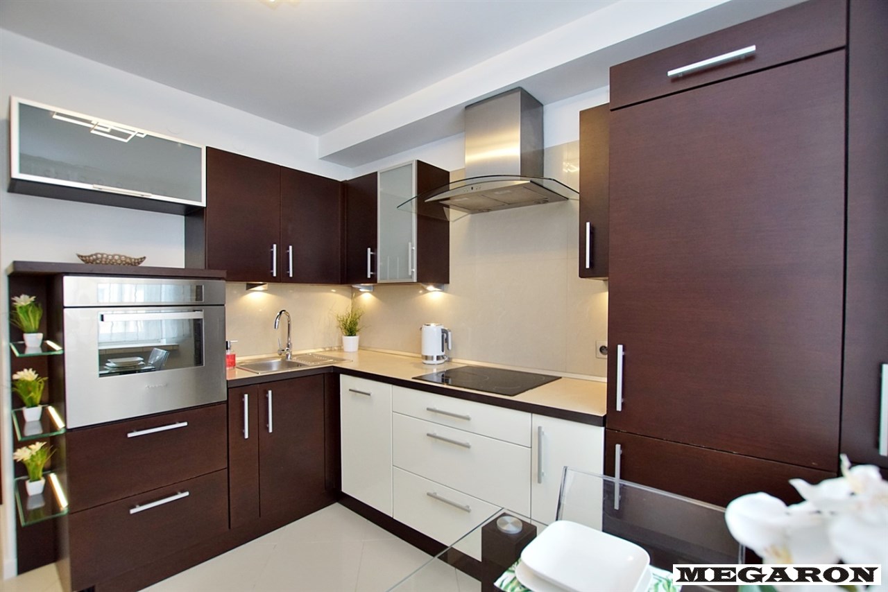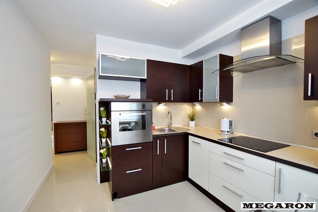 - płyta grzewcza Mastercook, - piekarnik Ariston, - lodówka z zamrażarką Whirlpool, - zmywarka Whirlpool, - designerski szklany pochłaniacz z chromowanej stali, - nowy czajnik Breville.Dodatkowo: szklany stolik, oświetlenie LED sufitowe oraz podświetlane półki LED. Na podłodze estetyczne płytki.